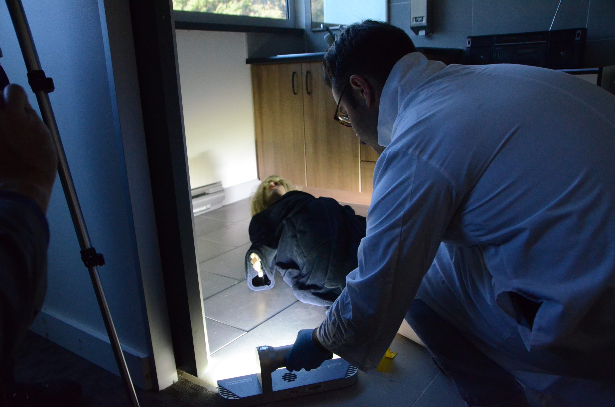 Nous sommes arrivés sur une scène de crime. Les enquêteurs pensent qu’il s’agit d’un meurtre déguisé en suicide. Nous commençons par prendre des photos et chercher des traces de pas à l’aide de lampes spécialement conçues à cet effet.