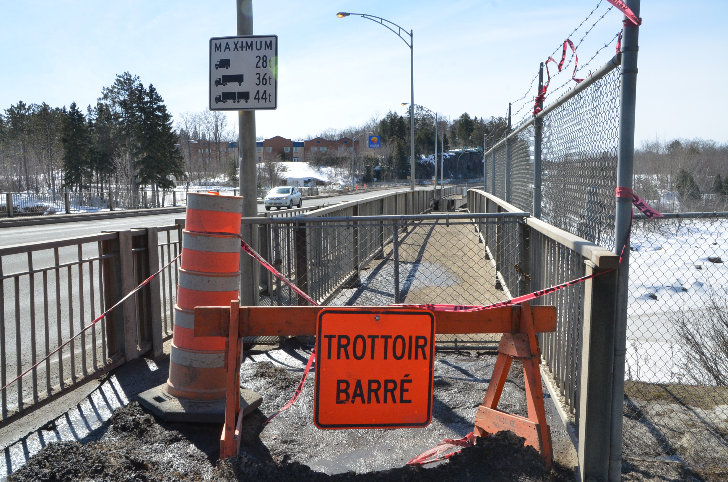 TRAVAUX. En raison de la passerelle piétonnière qui s’est affaissée au cours de l’hiver, des travaux seront réalisés du mercredi 28 mars au vendredi 6 avril prochain, du lundi au vendredi de 6h à 16h, sur le pont Marc-Trudel de la route 157 à Shawinigan qui enjambe la rivière Saint-Maurice.