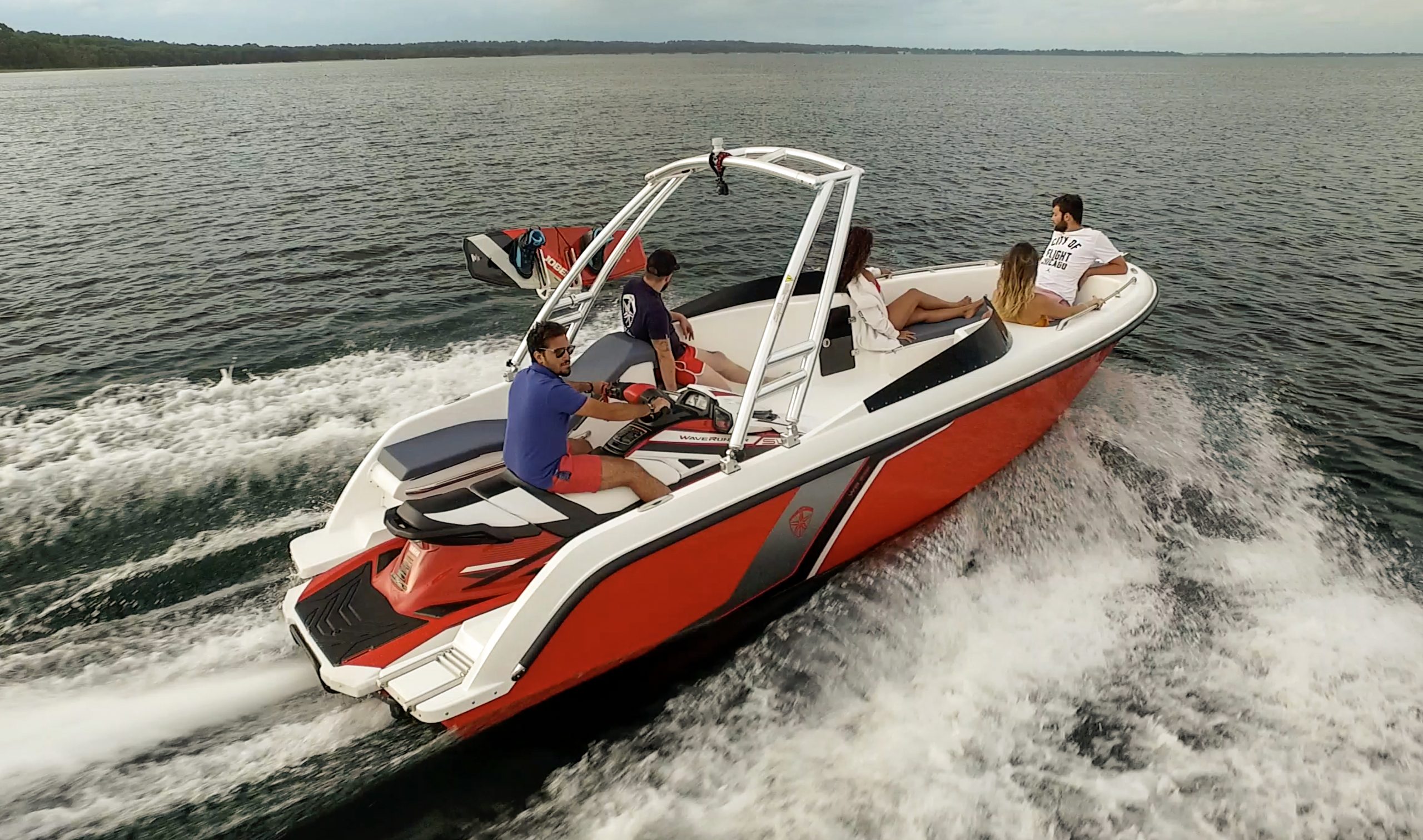 Le wave boat est adapté à tous les modèles de Sea Doo (sauf Spark), Yamaha et Kawasaki. Aussi ingénieux que simple, le système consiste à introduire la motomarine dans le réceptacle du bateau par des glissières. Ces dernières sont moulées aux formes des différents modèles et peuvent donc être changées facilement advenant l’achat d’une nouvelle motomarine. Le système est complété par une sangle qui vient ceinturer l’engin motorisé à l’arrière.