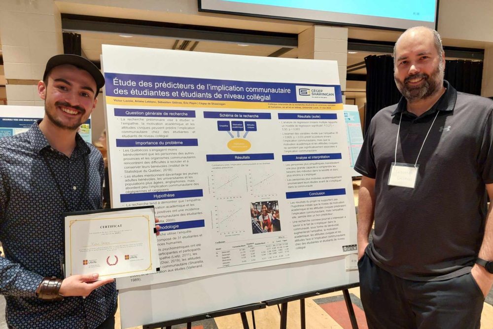 L’étudiant a présenté des résultats préliminaires d’une recherche pour laquelle il travaille à titre d’assistant de recherche avec les enseignants de psychologie Sébastien Gélinas et Éric Pépin. La communication, intitulée Étude des prédicteurs de l’implication communautaire des étudiantes et étudiants de niveau collégial, évaluait si l’empathie, la motivation académique et les attitudes civiques peuvent prédire l’implication communautaire.
