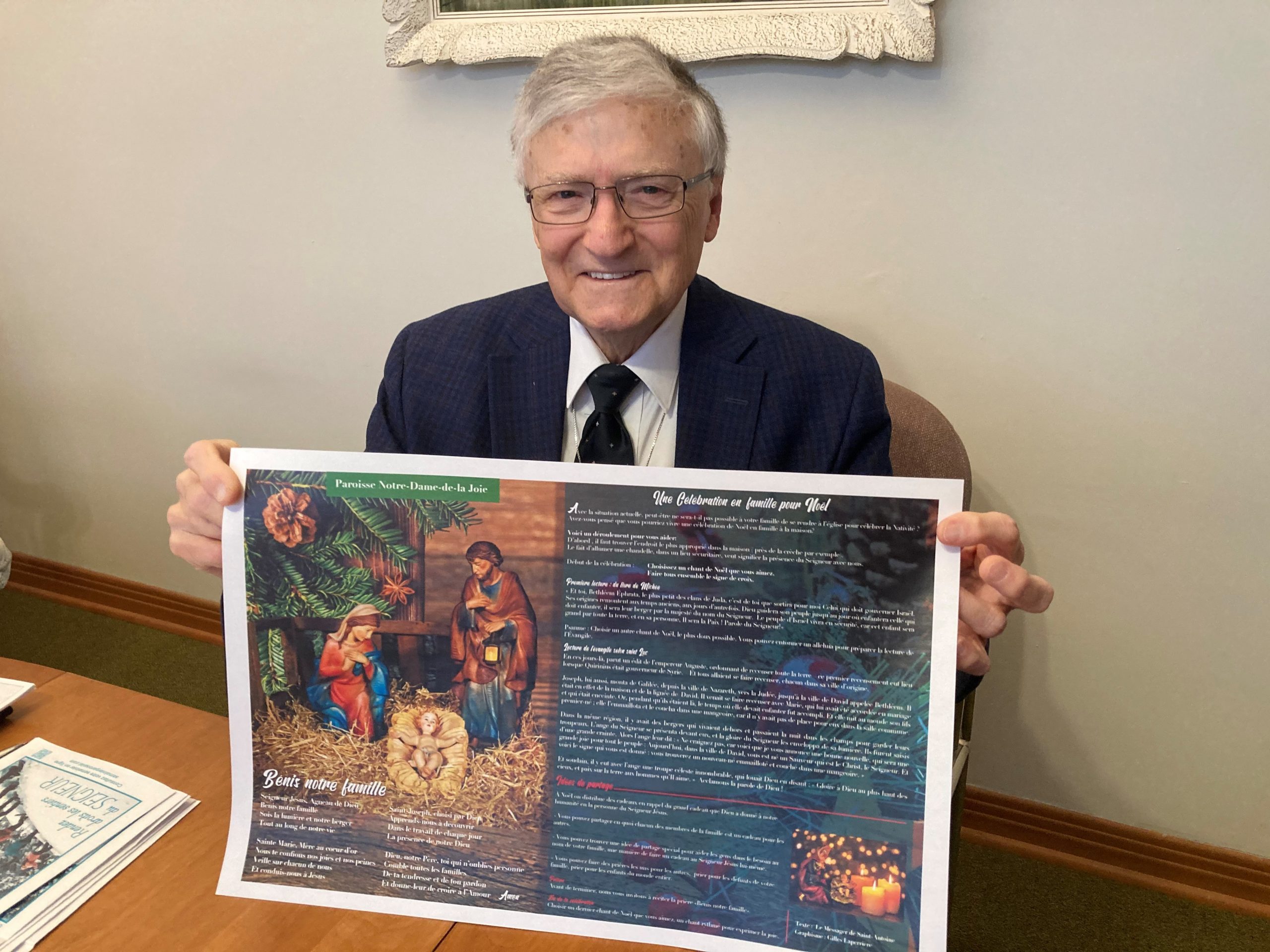 «À Noël, d’habitude les églises sont pleines. Pour les familles qui ne pourront pas venir, on a fait préparer un napperon pour faire une célébration de Noël en famille. Les gens pourront suivre sur Facebook, suivre à la radio, ou se faire une célébration à la maison avec les prières qu’on suggère. Des textes de Noël, des idées de partage, la bénédiction familiale… mais ça reste simple. C’est l’activité supplémentaire qu’on propose. Ceux qui veulent avoir des napperons, nous en avons de disponibles. Ça peut donner la chance à tout le monde d’être un peu missionnaire, et c’est la première fois qu’on met ça de l’avant.»