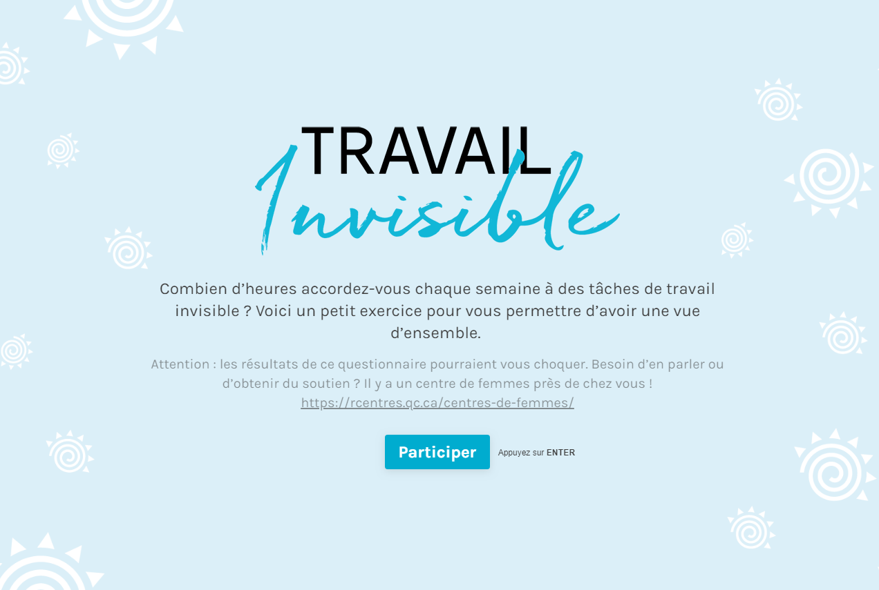 Le calculateur et plusieurs initiatives lancées récemment – comme des activités à ce sujet dans les centres de femmes – le sont en vue de la mobilisation du 1er mai, à Trois-Rivières: «Les femmes de la région sont invitées à rejoindre la manifestation organisée au Parc Champlain à Trois-Rivières de 11h à 13h, à faire la «grève du travail invisible», à partager sur les réseaux sociaux ce qu’elles entendent «grêver» avec le mot-clic #cestaussidutravail et à comptabiliser ce travail sur le calculateur en ligne sur notre site web https://rcentres.qc.ca/travail-invisible.html. Ces actions au choix de chacune, visent à démontrer l’ampleur et la valeur du travail qu’elles réalisent chaque jour sans salaire et souvent même, sans reconnaissance », invite Mme Lavigne.