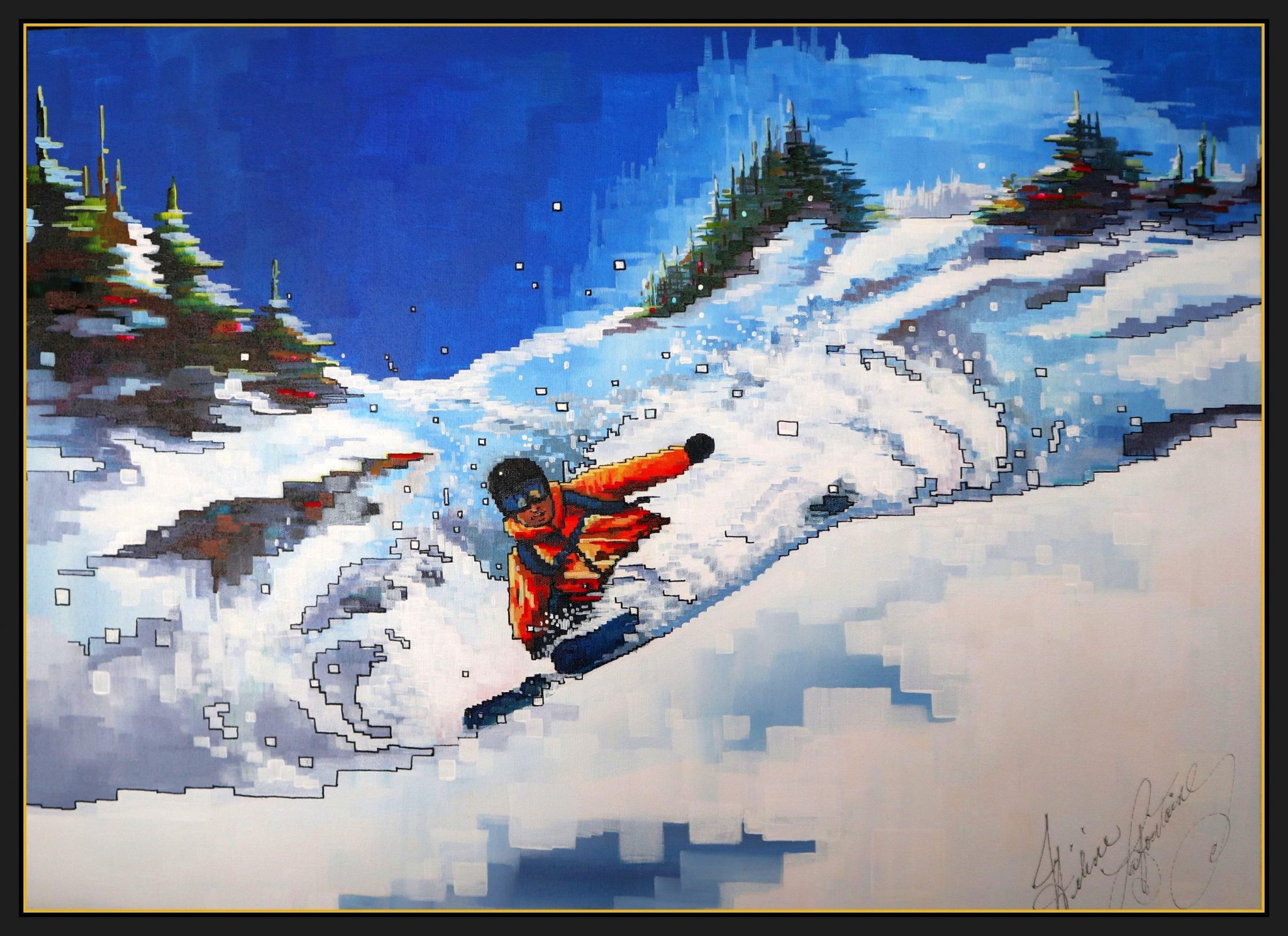 Hélène Lafontaine décrit le pixellisme comme étant “la structure des mouvements reconstituée. Tantôt marquants, tantôt subtils, les mouvements verticaux et horizontaux se juxtaposent et se chevauchent. Ils contiennent l’essentiel de l’image où tout le spectre de la palette est exploité. Ainsi, sous le pinceaux, les couleurs cassées par strates et par décomposition contribuent à l’œuvre.”