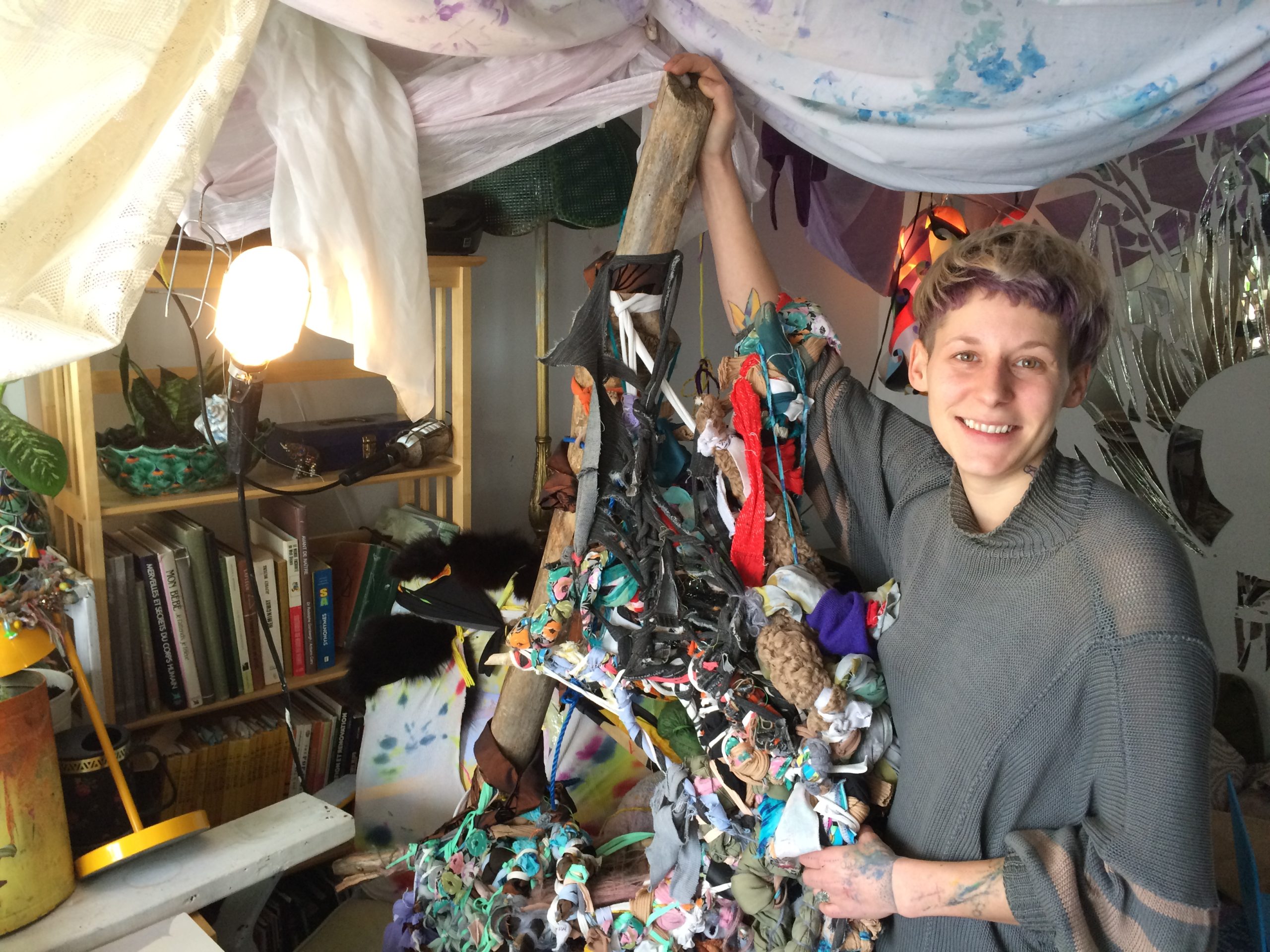 Déroutant et singulier, l’appartement-atelier d’Érika Lebrun est un joyeux bazar coloré. «Ma maison est une sculpture!» Du tissu et des objets récupérés s’amoncellent un peu partout.