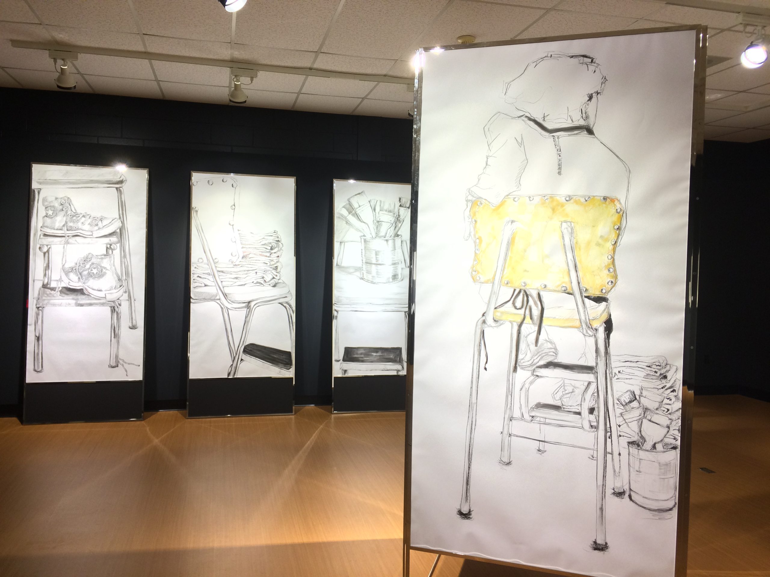 Dans la salle au rez-de-chaussée, la Montréalaise Darcia Labrosse présente Le shaman industriel. Les œuvres ont été réalisées en utilisant une peinture industrielle appelée électrostatique déposée sur des feuilles d’aluminium non-traitées ou anodisées. Le résultat final est un art qui résiste aux intempéries et aux éléments : les toiles, ou tôles, peuvent donc vivre autant à l’intérieur qu’à l’extérieur. Elles peuvent aussi se métamorphoser en sculpture.
