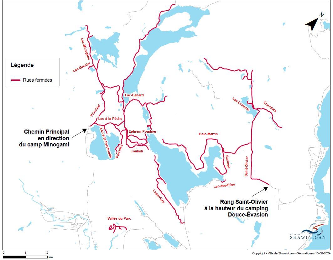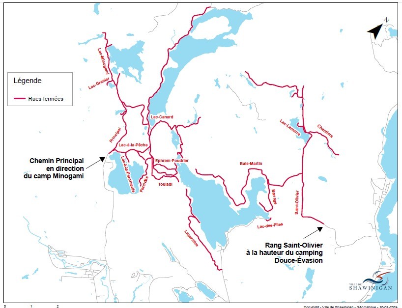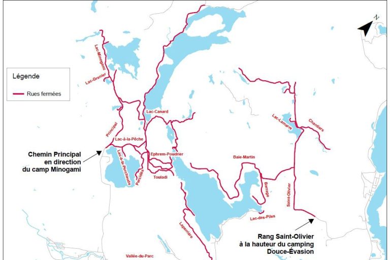 Chemin Principal dans le secteur Saint-Gérard, en direction du lac à la Pêche et du camp Minogami : L’accès à la circulation a été rouvert vers 19 h 30, en alternance. La Sûreté du Québec a été sur place aujourd’hui pour assurer une circulation sécuritaire et y est toujours présente.