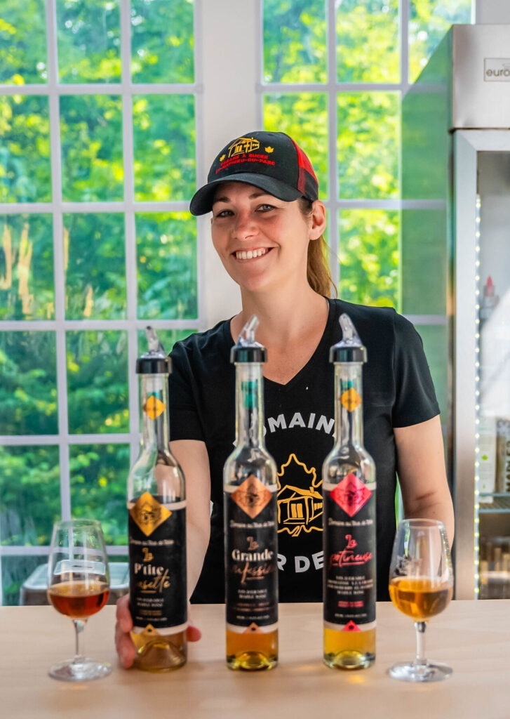 “On trouve que ça fait ressortir les arômes du sirop d’érable dans la boisson, mais c’est aussi une question pratique, faire la saison des sucres en même temps que d’être vigneron, c’est-à-dire s’occuper de la fermentation, ça serait vraiment difficile vu que nous sommes juste deux”, explique Evelyne Jacques qui œuvrait, comme son conjoint, dans le réseau de la santé avant de tout quitter en 2022 pour se consacrer à part entière à ce projet agrotouristique.